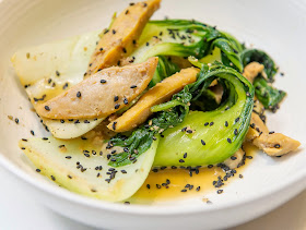 | bycze jądra, boy choy, sos imbirowy, czarny sezam |