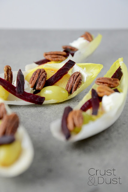 Sałatka na którą przepis znajdziecie niżej jest idealna dla osób, które nie przepadają na cykorią. Wolno duszone na maśle winogrona i jabłka z dodatkiem rozmarynu, słodkie pieczone buraki dobrze grają z delikatną goryczą liści. Żeby jednak nie było za słodko, w sałatce są kawałki sera typu feta i aromatyczne pekany. Z jednej strony przypomina to misz-masz nieco niezwiązanych ze sobą składników (bo te winogrona...), a z drugiej to intrygujący sposób na udowodnienie, że w kuchni liczy się wyobraźnia. Poza tym, te winogrona i jabłka sa słodkie i soczyste i dobrze maskują gorycz cykorii (której jedno z nas po prostu nie lubi. A tym razem zupełnie ją zaakceptowało).